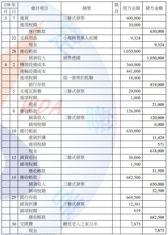 四、台中商店每二個月申報營業稅,上期累積留抵稅額 13,500 元。110 年 3 月 1 日至 4 月 30 日止之交易分錄資料如下:4 月份購入運輸設備為自用乘人小客車。試作:4 月底營業稅結帳分錄並編製營業人銷貨額與稅額申報書。(分錄 4 分,每一橫行 1 分,共計 20 分。若該空格金額為 0 者,不得以空白表達)
