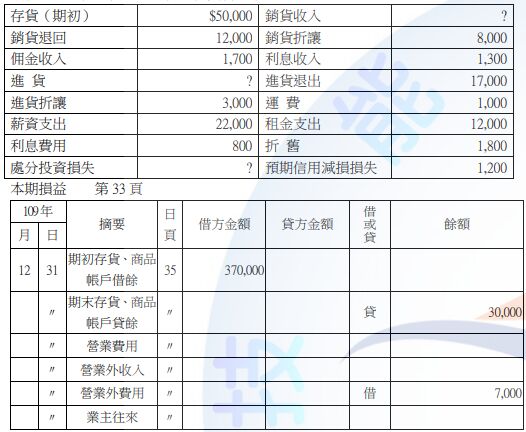 五、台中商店 109 年底進行結帳工作,商品帳戶採本期損益法結帳。其調整後損益帳戶餘額及本期損益分類帳結帳分錄部份過帳資料如下:試根據下列順序將結帳分錄記入日記簿並完成本期損益及業主往來分類帳過帳應有程序。⑴期初存貨及商品帳戶(借餘)結轉本期損益。⑵期末存貨及商品帳戶(貸餘)結轉本期損益。(期末存貨$20,000)⑶營業費用帳戶結轉本期損益。⑷營業外收入帳戶結轉本期損益。⑸營業外支出帳戶結轉本期損益。⑹本期損益帳戶餘額結轉業主往來。(每一結帳分錄 2 分、分類帳每一橫行 1 分)