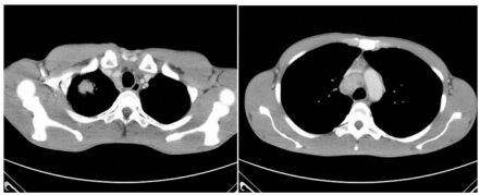 45. 65 歲女性病人,健檢意外發現右上肺有一顆腫瘤,縱膈腔也有數顆淋巴結(N2 multiple station Gr 2,4,7),如下圖,正子掃描無遠端轉移,無對側及鎖骨上淋巴結。腫瘤切 片為肺腺癌,無驅動基因突變,PD-L1(22C3)免疫染色 5%,下列治療方式何者較為適當? (A) 手術切除再接受術後輔助化療。 (B) 前導性化療(Neoadjuvant chemotherapy)後再接受手術切除。 (C) 不適合開刀,化療合併免疫治療是首選。 (D) 同步化放療(concurrent chemoradiotherapy)疾病無惡化再接受一年免疫治療作為鞏固 治療。