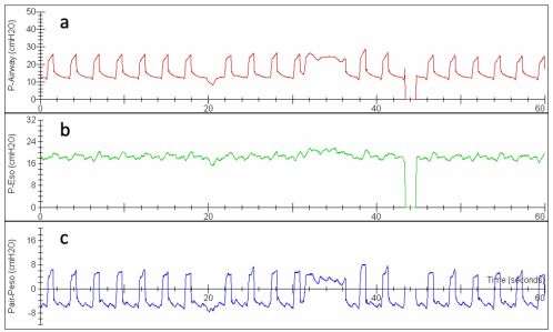 53. 下圖為一位 ARDS 病人 airway(a),esophageal(b) pressure tracing,及其相減的圖形 (c),何者正確? (A) 在吐氣時,transpulmonary pressure 約為 4 至 6cmH2O。 (B) 根據 tracing,可以考慮增加 PEEP,以改善 atelectasis。 (C) 可以考慮進一步減少 tidal volume,避免 ventilator-induced lung injury(VILI)。 (D) 根據 tracing,PEEP 大約為 18cmH2O。