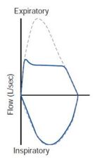 72. 患者的肺功能檢查 flow-volume loop 如下,虛線為預測正常值,此病患的可能病灶類型為: (A) Restrictive ventilatory impairment。 (B) Large airway obstruction:extrathoracic obstruction。 (C) Large airway obstruction:fixed obstruction。 (D) Large airway obstruction:variable intrathoracic obstruction。