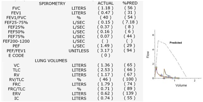 74. 以下肺功能檢查結果的判讀為?(A) Obstructive ventilatory defect。 (B) Restrictive ventilatory defect。 (C) Mixed obstructive and restrictive defect。 (D) Non-specific ventilatory defect。
