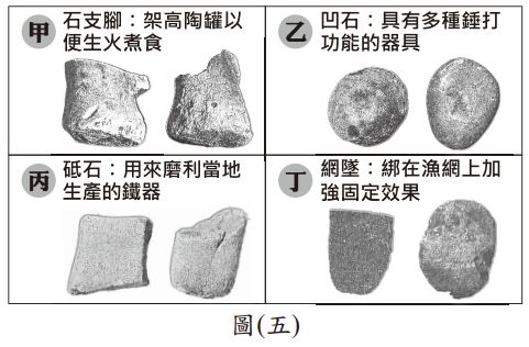 8. 圖(五)是臺灣某考古遺址中, 同一文化層出土的四種石器。 圖中何者最適合作為判斷該文化層所屬時代的證據? (A)甲 (B)乙 (C)丙 (D)丁
