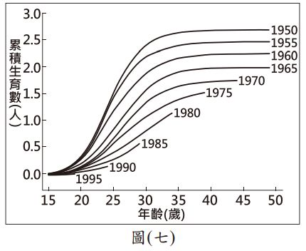 12. 圖(七)呈現某國不同年分出生的 婦女,在育齡期間累積的生育數。 為了改變圖中資料呈現的趨勢以維 持人口結構穩定,下列何者最可能 是未來該國政府採行的作法? (A)提高幼兒教育補助金額 (B)加強宣導節制生育觀念 (C)提供弱勢學童輔導課程 (D)增設高齡安養照護機構