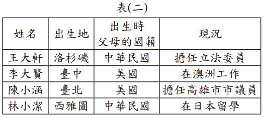 13. 表(二)是四位同窗好友的相關資料。若僅根據表中 內容判斷,何者最可能不曾具有我國國籍? (A)王大軒 (B)李大賢 (C)陳小涵 (D)林小潔
