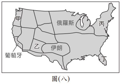 15. 美國具有多樣化的氣候類型,圖(八) 是將美國各區域與世界上其他國家的氣候特徵相比,把具有類似氣候特徵的國家標示在該區域上。臺灣最可能標示在圖中甲、乙、丙、丁 何處? (A)甲 (B)乙 (C)丙 (D)丁