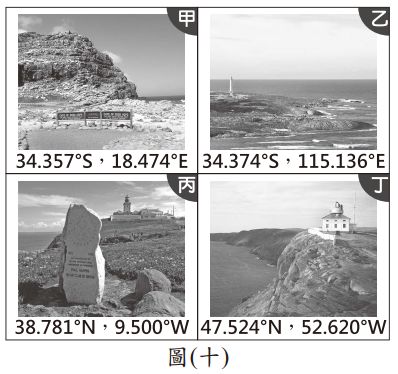18. 圖(十)為全球四個著名岬角的位置資訊,其中何者位於歐亞大陸西部海岸? (A)甲 (B)乙 (C)丙 (D)丁
