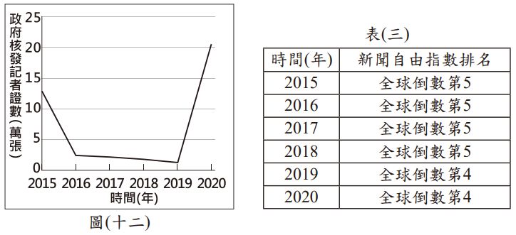 23. 甲國政府自2019年起,要求記者須通過關於國家領袖思想的考試後,才能取 得記者證,藉以強化他們對國家領袖的效忠。圖(十二)是近年該國政府核發記 者證數量的變化,而表(三)則是無國界記者組織提出的全球新聞自由指數報告 中,該國近年的排名狀況,排名越前面代表新聞自由程度越高。根據相關資 訊判斷,關於甲國政府的此項作法,下列敘述何者最合理? (A)政府藉由立法規範,以保障記者的新聞自由 (B)政府採取獎勵政策,以促使新聞產業蓬勃發展 (C)政府削減新聞記者人數,以便管控媒體報導內容 (D)政府透過管控記者思想,以影響閱聽人接收的新聞