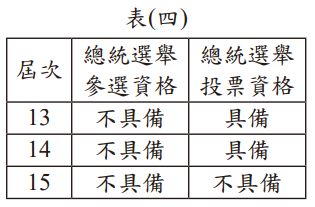 24. 表(四)呈現阿森在近三屆我國總統選舉資格的變化情形。根據表中內容判斷,阿森在第14屆 至第15屆之間,最可能發生了下列哪一件事? (A)被政黨開除黨籍 (B)遭法院監護宣告 (C)遷移戶籍至其他縣市 (D)遭法院判處褫奪公權