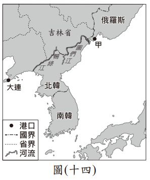 27. 2014年中國 吉林省與俄羅斯合作擴建圖(十四)中的甲港口,目前出口貨物可不經由大連港,透過甲港口可大幅縮短與鄰近國家部分港口的航運時間。擴建甲港口除上述目的外,最可能還含下列何優勢? (A)作為俄羅斯船隻通往大西洋的出海口 (B)加速俄羅斯將開發重心轉向歐俄平原 (C)作為中、俄兩國鴨綠江流域貨物出入的港口 (D)提供中國船隻藉由此港口通往北極海的捷徑
