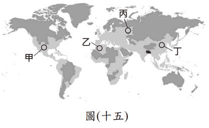 28. 2014年世界上只有5%的人口居住在 圖(十五)中的深灰色區域;而相同數 量的人口則居住在圖中黑色區域。小 齊想要在地圖上的淺灰色區域,以圓 圈標示另一個人口數量最相近的範圍,則他標示在下列何地最為適宜? (A)甲 (B)乙 (C)丙 (D)丁