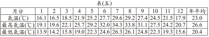 29. 世界氣象組織(WMO)定義熱浪標準為連續 5日的每日最高氣溫,皆高於歷年最暖月的最高氣溫平均值5℃以上。表(五)為臺北測站1981至2010年氣溫相關資料,根據上述定義,臺北在下列何種情形即達到此一熱浪標準? (A)連續5天出現31.6℃以上高溫 (B)連續5天出現34.3℃以上高溫 (C)連續5天出現34.6℃以上高溫 (D)連續5天出現39.3℃以上高溫