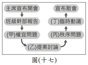 33. 開班會時,有些同學在玩牌、有些同學在吃東 西,阿偉認為吵雜聲使他聽不清楚其他人的發言內容,影響到他參與會議的權利。圖(十七)是 當日班會的部分過程,阿偉應是在圖中哪一階段要求主席處理上述問題? (A)甲 (B)乙 (C)丙 (D)丁