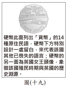 38. 圖(十九)中的硬幣為位在南半球的某國於2019年所發行。自歐洲人十八世紀移入該地以來,已有約130種原住民語絕跡。該國希望藉由此硬幣的發行,提醒人民保存、維護和活化原住民語的重要性。上述硬幣最可能由下列何國發行? (A)印度 (B)秘魯 (C)澳洲 (D)菲律賓