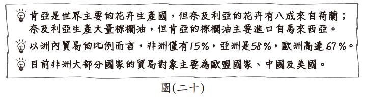 40. 圖(二十)為小成在研究2017年非洲貿易現況時所發現的某些現象。非洲各國採 取下列何項措施,最可能有助於改善非洲這些現象? (A)限定與非洲其他國家的進口配額,保護本國產業 (B)改善與其他洲的交通運輸,降低貨物的運輸成本 (C)強化邊境的管制措施,防止鄰國非法貿易的進行 (D)簽署非洲自由貿易協定,降低非洲國家間的關稅