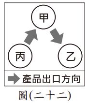 42. 圖(二十二)呈現甲、乙、丙三國的貿易情況。若甲國受匯率變動的影響,使得某段時間的進、出口商品數量皆大幅增加,則根據圖中內容判斷,該段時間甲國貨幣的匯率變化,最可能為下列何者? (A)相對乙、丙兩國貨幣皆升值 (B)相對乙、丙兩國貨幣皆貶值 (C)相對乙國貨幣升值,但相對丙國貨幣貶值 (D)相對乙國貨幣貶值,但相對丙國貨幣升值