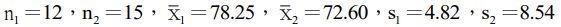 40. 若想要檢定兩母體平均數是否相等,今從兩常態母體中隨機抽取兩樣本,其資料摘要為,在假設母體變異數不相等,且顯著水準 α=0.05之下,其檢定統計量的值為? (A) 0.791 (B) 1.697 (C) 2.042 (D) 2.167