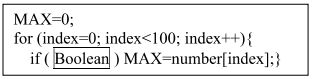 23. 下列程式片段中 Boolean 空格填入何式,可使程式片段執行完 MAX 之值為正整數陣列 number[100] 中元素之最大值?(A) MAX>number[index+1] (B) MAX>number[index] (C) MAX=number[index] (D) MAX<number[index]