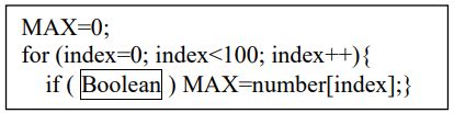 23.下列程式片段中空格填入何式,可使程式片段執行完 MAX 之值為正整數陣列 number[100]中元素之最大值?(A) MAX>number[index+1] (B) MAX>number[index](C) MAX=number[index] (D) MAX<number[index]