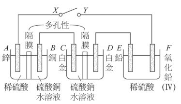 21. 使下圖裝置中的電流通過時,下列敘述何者正確? (A)電流的方向為 F→Y→X→A (B)電極 A 的質量減少 (C)電極 C 的質量減少 (D)電極 D 附近溶液呈酸性 (E)電極 E 的質量增加。