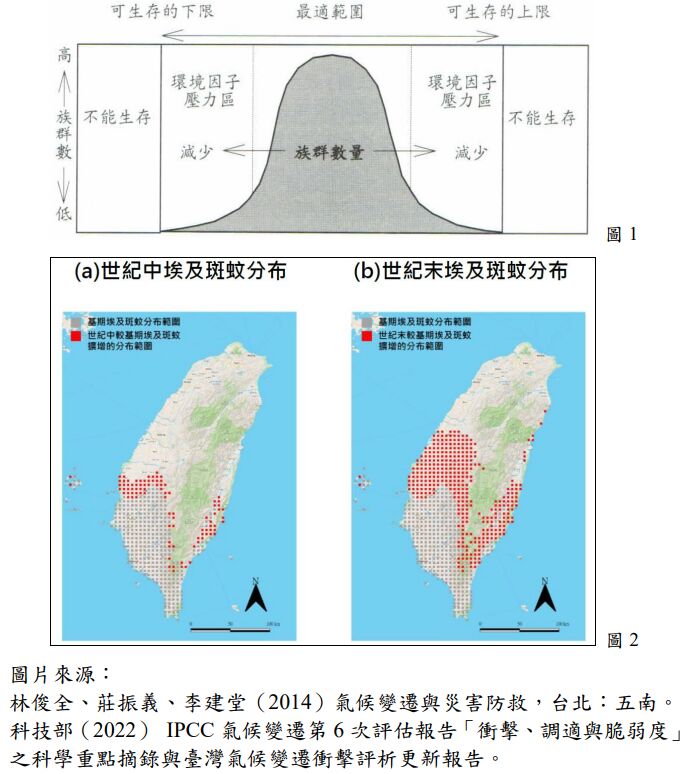 四、生物對每種環境因子皆有特定適應範圍,因此,環境因素會影響生物種類與分布情形,圖1顯示生物族群數量與環境因子之關係。科技部根據聯合國政府間氣候變遷專門委員會2021年第6次評估報告之科學數據,推估在氣候變遷持續升溫情境下,臺灣的埃及斑蚊分布區域的變化(圖2)。試運用圖1概念,說明臺灣北、中、南、東各區在氣候變遷下的登革熱風險?