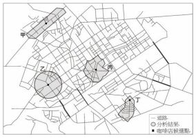 4. 地理學中的區位理論,通常假設地表為均質,以直線距離劃設空間範圍,但在真實生活中,依規劃的需求,範圍多以 路徑距離為劃設的依據。依上所述,右圖中有甲、乙、丙、丁四個分析結果, 若咖啡店開設的重要選址條件是「徒步300 公尺內有停車場」,下列何者最可能 是距離咖啡店候選點徒步 300 公尺內的範圍?(A)甲 (B)乙 (C)丙 (D)丁