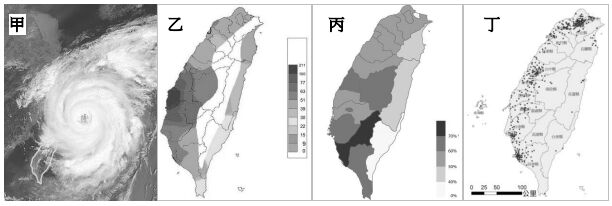 7. 地理資訊系統主要以兩種格式呈現空間資料,下列四張圖為採用地理資訊系統製作的 成果,請問哪兩地圖的主要資料圖層是以向量格式呈現? (A)甲乙 (B)甲丙 (C)丙丁 (D)乙丁