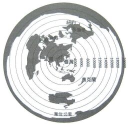 8. 右圖是以臺灣為中心的世界地圖,下列五位 同學對該圖的描述如下:大瑋:臺灣至各點的距離比例正確;小彤:孟買與紐約相差約 6000 公里;小融:圖中離臺灣最遠之處為南極;阿翰:圖中同心圓亦為緯線;萱萱:此繪製法也適合繪製飛彈射程範圍地圖五位同學描述正確者為: (A)大瑋、萱萱 (B)小彤、小融 (C)大瑋、阿翰 (D)小融、萱萱