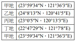 19. 2020 年因為新冠肺炎疫情關係,讓許多國人暑假出國旅遊的計畫泡湯,剛考上高中的小翊和家人開車出遊,安排國內四天三夜的行程,下表是小翊利用手機定位,依序紀錄出發地甲及沿途所經各大城市乙丙丁的經緯度,最後再回到甲地。依據經緯度資料判斷,下列何者是小翊的旅遊行程地點? (A)宜蘭→台北→台中→花蓮→宜蘭 (B) 花蓮→台中→台南→台東→花蓮 (C) 花蓮→台東→台南→台中→花蓮 (D)宜蘭→花蓮→台中→台北→宜蘭