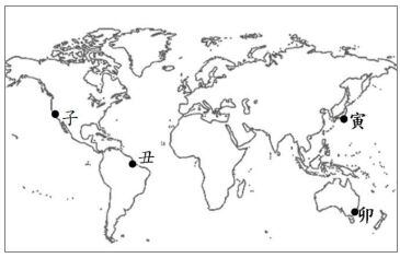 42. 左下全球圖子丑寅卯四地中,哪一地區最容易遭受地震及野火的自然災害侵襲?(A) 子 (B)丑 (C)寅 (D)卯。