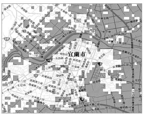 43. 利用全球淹水模擬網站進行海平面上升十公尺後,蘭陽平原的淹水範圍模擬。右上 圖截取宜蘭市一帶的淹水範圍模擬圖,深色色塊為模擬後的淹水範圍。圖中展現的 地理資訊,具有下列哪兩項特徵? 甲、圖上地名與淹水範圍屬空間資料; 乙、淹水模擬以地勢分析的方式取得; 丙、模擬結果可以展現海拔相對高低; 丁、圖中的淹水範圍以向量模式儲存。 (A)甲乙 (B)甲丁 (C)乙丙 (D)丙丁