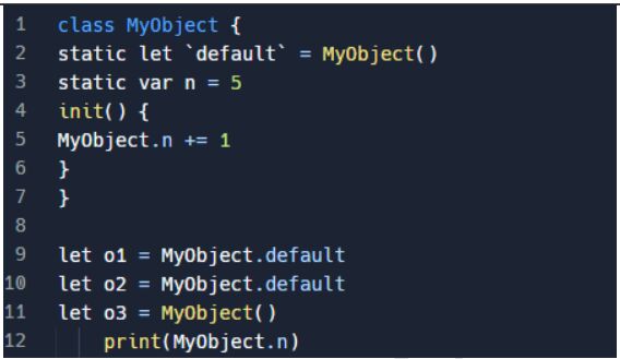 5. 如附圖所示為 Swift 程式,針對下述程式碼的敘述,何 者「錯誤」? (A) 此類別具有單例(singleton)功能 (B) 程式碼中的 o1 與 o2 完全相等,包含記憶體位 置均為一樣,但 o3 則不同 (C) 最後印出的值為數字 8 (D) o3 稱為類別 MyObject 的實體