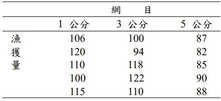 一、2005 年某拖網漁船以三種網目大小所捕獲每網次海蝦重量如下表,假設此三組樣本資料所來自的母全體為常態分布且變異數皆相同,請以 α=0.05 檢定網目大小對漁獲量有無影響。