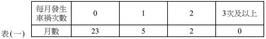 22. 一研究想要知道某一十字路口每月發生車禍的次數是否適合用卜瓦松 ( Poisson ) 分配來描述,因此連續觀察30個月後,得到30個月車禍發生次數的統計結果如表(一)。由下列資訊想要知道每月發生車禍的次數是否適合用卜瓦松分配,可以使用下列哪一種方法? (A) 單一母體比例的檢定 (B) 變異數分析 (C) 卡方適合度檢定 (D) 迴歸分析