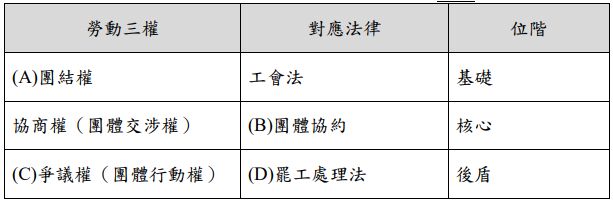 26. 在下列勞動三權與勞動三法的對應關係表格中,何者有誤?
