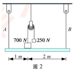 4. 一重量為 100 N 的均勻直桿由二條垂直的繩索 A、B 懸吊在如圖 2 所示之水平位置上,直桿上有一 700 N 的重物,該重物與另一 250 N 的重物經由一繩索懸吊在一滑輪上,若重力的方向為垂直向下,則繩索 A 所受的張力為:(A) 350N (B) 200N (C) 250N (D) 275N