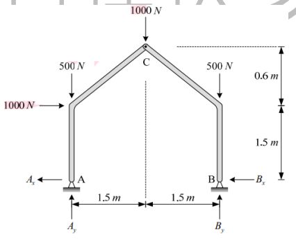 5. 圖 3 之構架,若不計桿重,則下列敘述何者不正確:(A) Ax=285.7 N (B) Ay=500 N (C) Bx=1285.7 N (D) By=1500 N