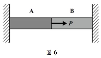 10. 如圖 6 所示兩端固定之桿件由 A、B 兩種不同材料的桿件接合而成,兩者均為延性材料,兩桿件有相同長度,斷面積均為 2.0 cm2。A 桿件的降伏應力σy=450 MPa,B 桿件的降伏應力σy=300 MPa。若安全係數為 1.5,則整個桿件的最大容許荷重 P 為何?(A) 45 kN (B) 50 kN (C) 85 kN (D) 100 kN