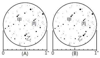 8. 阿豪利用學校的天文望遠鏡拍攝某一區域星空的照片如右圖 A 所示,半年之後再拍攝同一區域的星空得 圖 B,比對兩照片發現,甲、乙兩星的位置與先前不 同,但丙星與其他星體的位置幾乎不變。已知此照片 的視野直徑為 1 角秒,請問乙星距離地球約多遠?