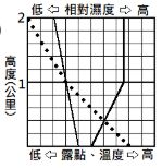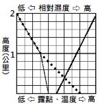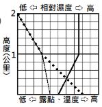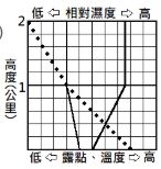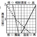 11. 高山迎風面常有雲霧出現,假若有一團未飽和空氣受山坡坡面抬升至 1 公里高後開始凝結成雲,且發展至 2 里高之上的山頂但未降水,則該空氣隨高度增加其溫度(點線)、相對濕度(粗黑線)與露點(細黑線)的變化較可能為下列何圖所示? (A)(B) (C) (D) (E)