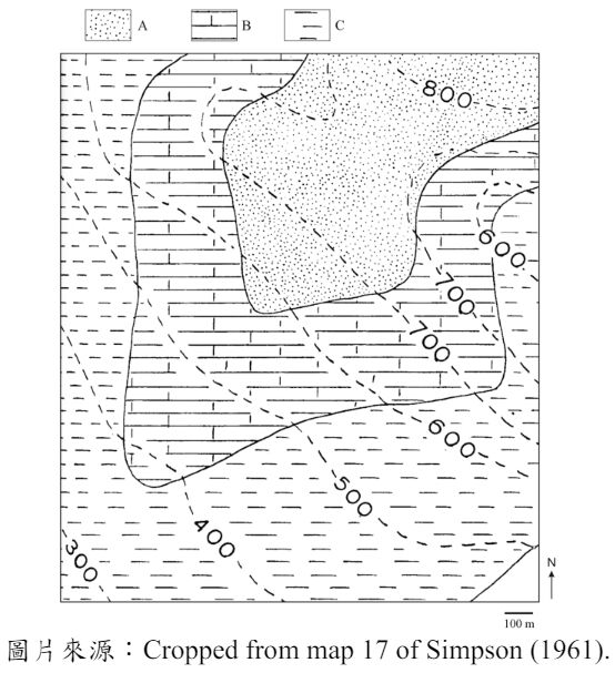 14. 下圖為某地的地質圖,圖中虛線為等高線,A、B、C 則為不同的沉積岩層,若此地岩層未經過倒轉,請推測此地的地質構造應為下列何者?哪一個地層的年代最老?( A )背斜 ( B )向斜 ( C )斷層 ( D )A 地層 ( E )B 地層 ( F )C 地層。(A)BE (B)ADF (C)AEF (D)CDE