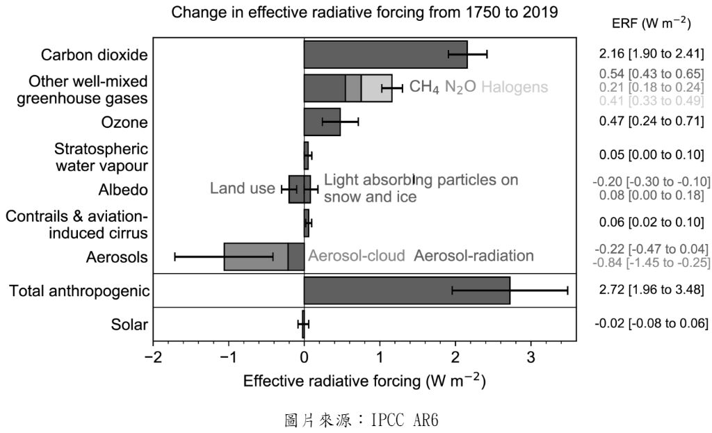 15. 下圖為 1750 年至 2019 年有效輻射強迫(ERF)的變化,下列關於此圖的敘述哪些正確? (A)氣懸膠的估算誤差較其他因子大 (B)凝結尾會反射太陽光,造成的負有效輻射強迫 (C)土地利用的改變造成反照率增加,將使地表接受到的太陽能量減少 (D)二氧化碳的貢獻約為甲烷的 4 倍,故可推知兩百多年來二氧化碳增加的量為甲烷的 4 倍。 (E)正有效輻射強迫是指地球接收到的太陽輻射的能量多於它向太空釋放輻射的能量,導致地球 氣候變暖。