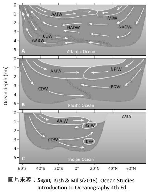 20. 下圖為三大洋垂直向的水團分布,圖中白色箭頭代表水團的流向。下列關於此圖與水團的敘述,何者有誤?(A)垂直向的水團分布主要是依照海水的溫度、鹽度性質來辨識的 (B)太平洋 的平均海底深度為較其他二者深 (C)CDW 的密度較大部分的水團大 (D)同樣密度的兩水團經 過混合之後密度會增加 (E)各水團會流經三大洋之後再匯流到表面洋流。