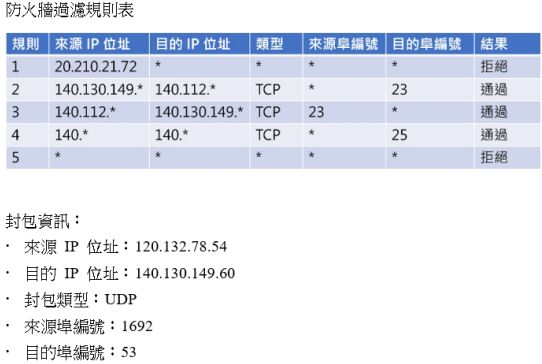 5. 附圖為防火牆的過濾規則表及封包資訊。在判斷封包是否通過防火牆時,請根據規則表來決定並選擇正確的選項。請問該封包依據防火牆規則是否通過,以及符合哪條規則?(A) 通過,符合規則 1(B) 通過,符合規則 3(C) 通過,符合規則 4(D) 被拒絕,符合規則 5