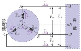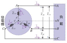 3.下圖的發電機,將三個繞組的線尾(A'、B'、C')連接在一起,稱為中性點(neutral point)N,另一端的三個線頭(A、B、C)分別接到負載,這種接法外形像一個倒「Y」字,因此稱為 Y 形連接。(A)對(B)錯