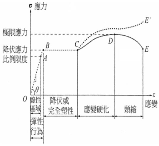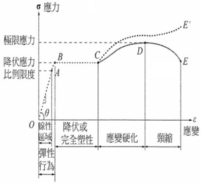 (A)在彈性範圍內,物體會產生永久變形 (B)在曲線的降伏區內,意指應力無明顯的改變但應變會明顯改變 (C)在曲線上判斷韌性或脆性是利用極限應變與降伏應變之比來判斷 (D)斷裂(破裂)點為應力的最高點 。