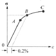 (A)0.2%稱為永久變形(B)過 0.2%作一平行 OA 的直線交曲線於 B 點,B 點稱為彈性限度 (C)C 點稱為破裂點(或極限應變) (D)本圖為脆性材料曲線 。