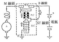 (A)電磁開關主接點(M.S)閉合時吸入線圈(P.C)沒有電流 (B)電磁開關主接點(M.S)吸住線圈(H.C)沒有電流 (C)起動開關由 ON 至 OFF 瞬間,吸入、吸住線圈(PC、HC)都沒有電流 (D)起動開關由 ON 至 OFF 瞬間,吸入線圈(P.C)有電流,吸住線圈(H.C)沒有電流 。
