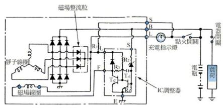14. 多數含 IC 調整器的交流發電機充電系統,剛開始的磁場電流是由那一個線頭供給? (A)A (B)S (C)L (D)R 。