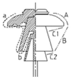 (A)虛線 a、b 所示者為洩漏距離 (B)A+B+C2=d 為乾閃絡距離 (C)ΣC 為濕(注水)閃絡距離 (D)A+B+ΣC 為衝擊波閃絡距離 。